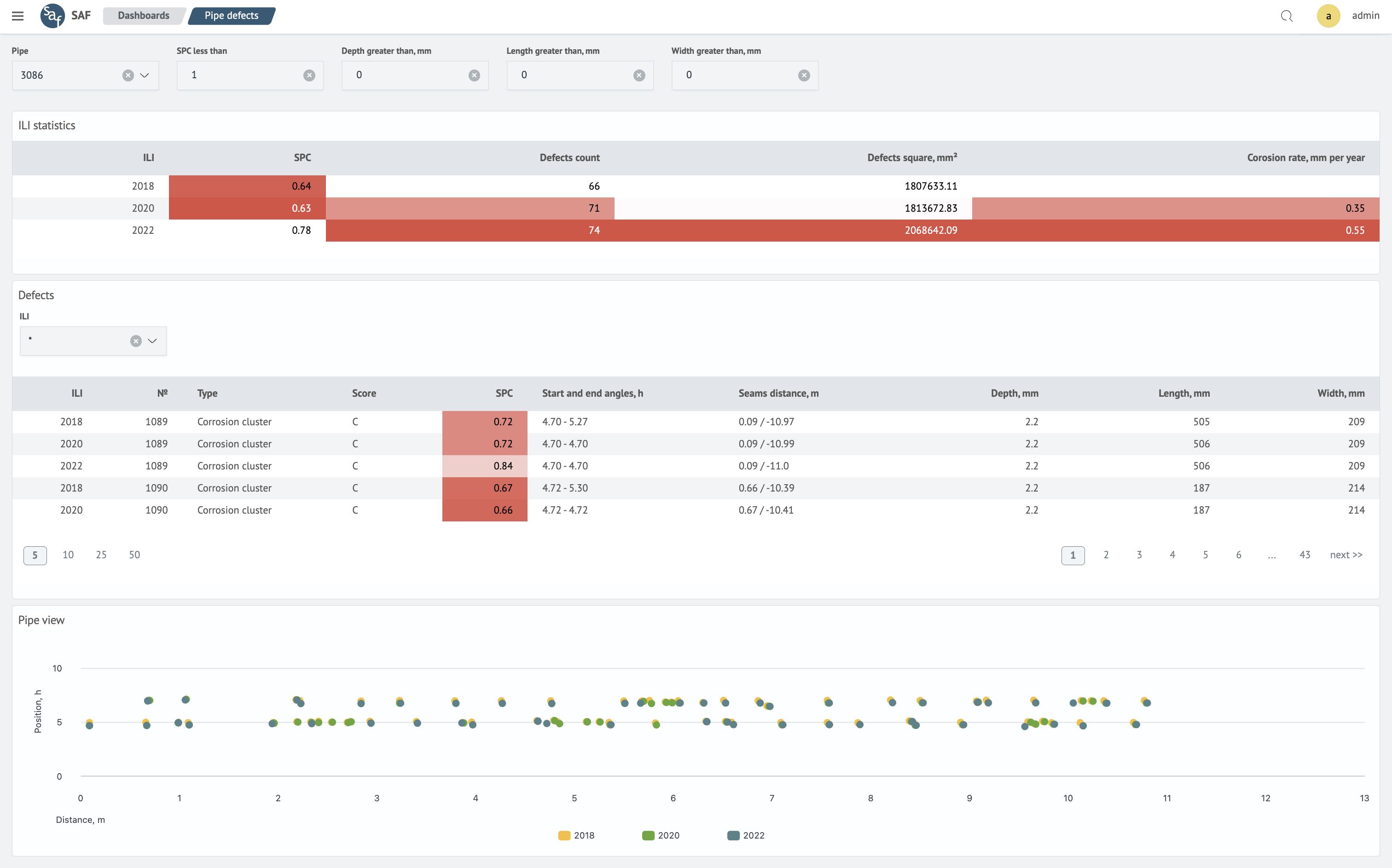 Monitoring the results of the ILI comparison (the number of matched and non-matched pipes, the number of pipes with corrosion defects and other anomalies), tracking statistics on groups of various defects divided into sections between crane platforms, analysis of summary statistics for each pipe, taking into account the comparison of all ILI.